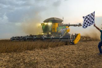 Usando uma colheitadeira CR 10.90 IntelliSense™, da New Holland, produtor de Luís…