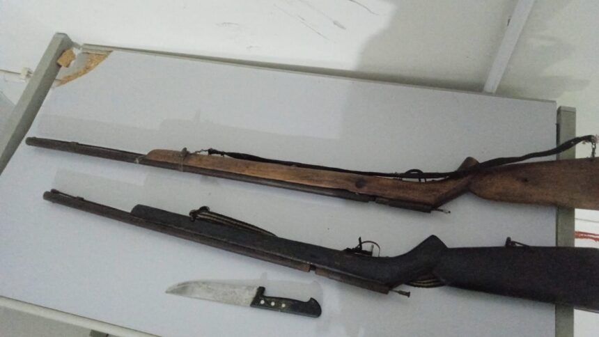 Durante a abordagem, os militares encontraram duas espingardas de fabricação caseira e uma faca tipo peixeira, que estavam em posse do indivíduo.