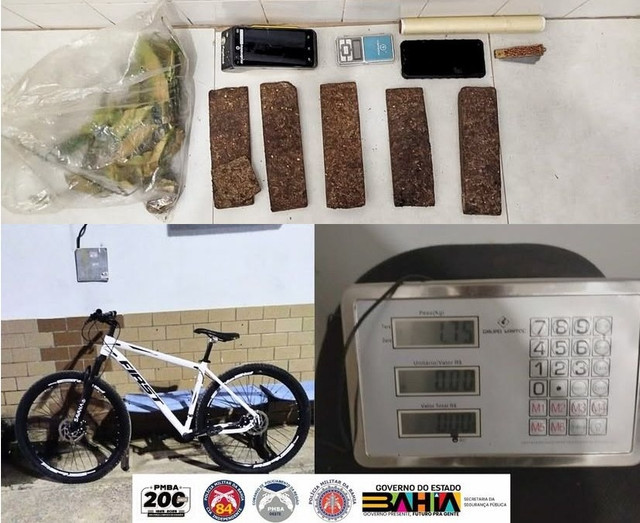 Ao notar a aproximação da guarnição, o suspeito fugiu, abandonando uma sacola contendo aproximadamente 1,75 kg de uma substância semelhante à maconha (cinco tabletes prensados), além dos seguintes itens: