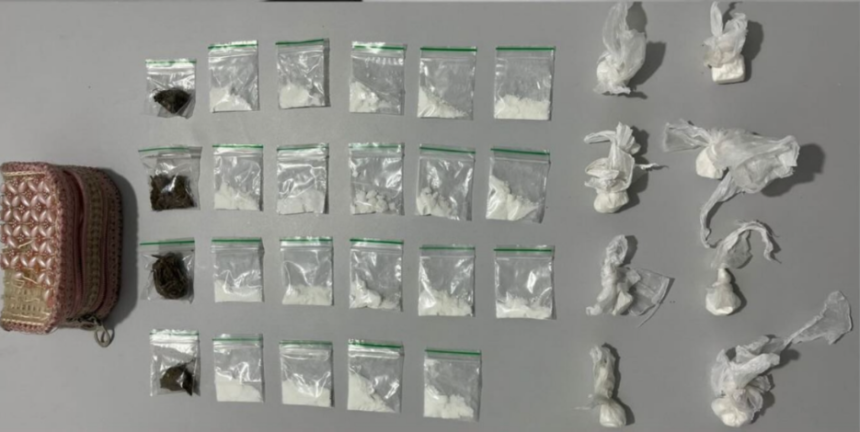 Durante as buscas nas proximidades, os policiais localizaram, em frente ao imóvel, dentro de um fogão que estava na calçada, uma bolsa feminina de cor rosa. No interior da bolsa, foram encontradas diversas porções de substâncias análogas à cocaína e maconha.