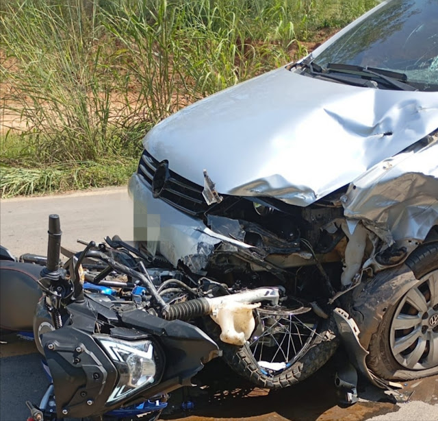 De acordo com as primeiras informações, o impacto da batida causou grandes danos na parte frontal do automóvel. A motocicleta ficou caída ao solo após o acidente.