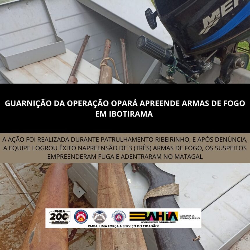 Na manhã da última segunda-feira (06), uma guarnição de serviço da Operação Opará, durante patrulhamento ribeirinho, recebeu denúncia de que indivíduos estariam efetuando disparos de arma de fogo no povoado de Ilha Grande, zona rural de Ibotirama, de posse das informações, a equipe se deslocou até a localidade onde visualizou dois homens, que ao avistar os policiais empreenderam fuga adentrando o matagal, dispersando 3 (três) armas de fogo. Diante dos fatos, todo material foi apresentado na Delegacia Territorial de Ibotirama.