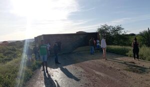 Na manhã deste domingo (9), um compartimento de carreta tombou na BR-242, no trecho que passa por Muquém do São Francisco. O incidente ocorreu próximo à entrada da Aldeia Kiriri, resultando na interdição total da pista.