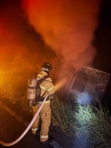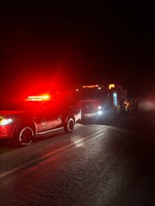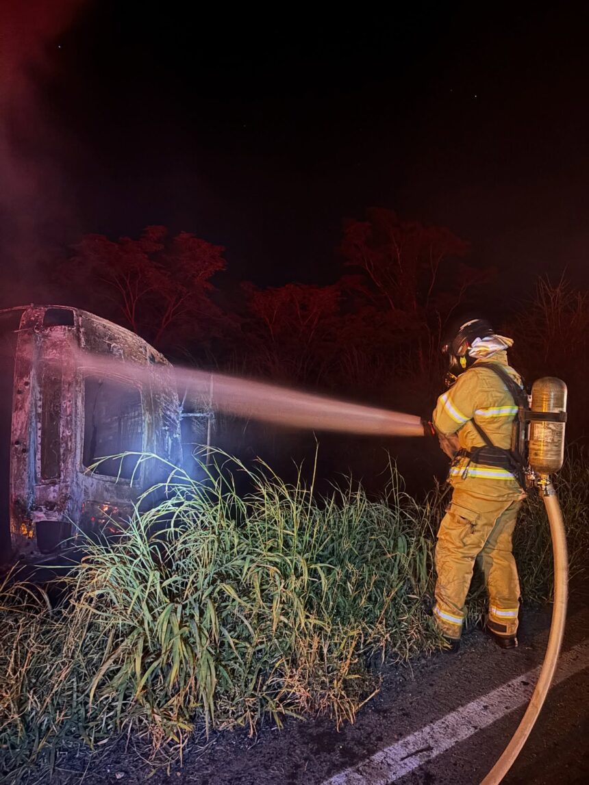 De acordo com as informações, o veículo foi encontrado tombado às margens da rodovia, com chamas concentradas na cabine.