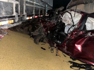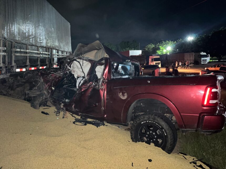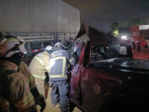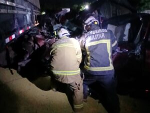 No local, os bombeiros encontraram um homem de 40 anos preso às ferragens de um veículo Dodge Ram, após uma colisão lateral com uma carreta bitrem. As equipes realizaram o isolamento da área, garantiram a segurança da cena e executaram os procedimentos necessários para o acesso à vítima.