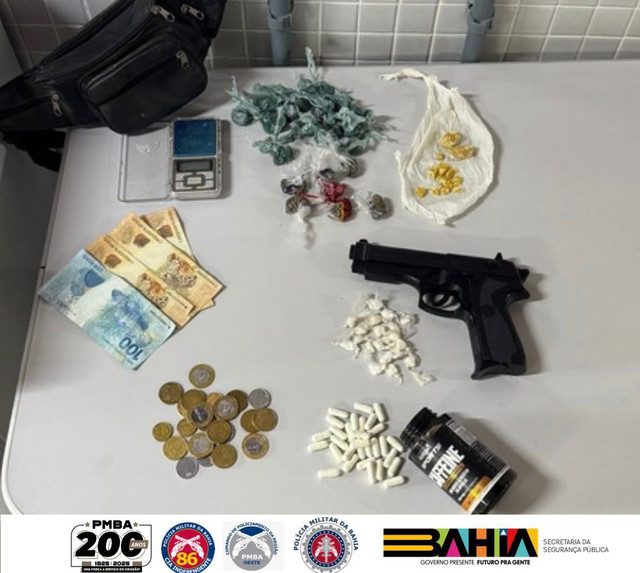 Na cintura do abordado foi localizado um simulacro de arma de fogo, tipo pistola. Em uma pochete que o mesmo portava, foram encontradas diversas porções embaladas de substâncias análogas à maconha, cocaína e crack, além de uma balança de precisão, um frasco contendo substância em pó aparentando ser cafeína, e certa quantia em dinheiro em espécie, possivelmente proveniente da comercialização ilícita de drogas.