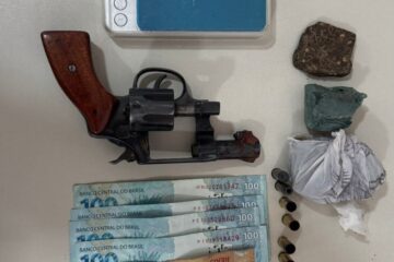 Com o homem foram encontrados um 01 revolver .32, marca Taurus, 54 gramas de substancia análoga a maconha e R$ 480 reais em dinheiro.