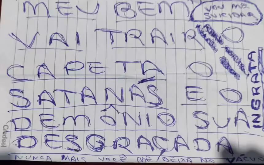 Uma mulher de 43 anos, vítima foi identificada como Terezinha Pires dos Santos foi morta com um tiro no pescoço na terça-feira (4), na cidade de Santa Maria da Vitória, no oeste da Bahia. Ao lado do corpo, foi deixado um bilhete com a frase: “Meu bem, vai trair o capeta, o satanás e o demônio, sua desgraçada. Nunca mais você me deixa no vácuo. Ingrata”. O companheiro da vítima é o principal suspeito de cometer o crime, informou a Polícia Civil.